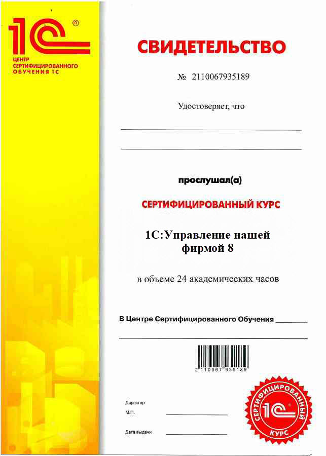 Каждый слушатель получает именное свидетельство фирмы "1С" и методические материалы.